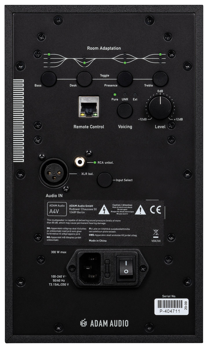 L'ADAM A8H offre les mêmes fonctions et le même contrôle des paramètres, situés sur le panneau arrière, que l'A77H et les autres moniteurs de la série A. L'entrée analogique est assurée par une connexion XLR 3 pts symétrique ou par une connexion RCA (phono) asymétrique. Le niveau est contrôlé par un bouton rotatif allant de -12dB à +12dB. L'alimentation, qui est commutée, est assurée par un connecteur secteur IEC.