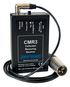Logé dans un boîtier moulé gris, le CMR3 a une DEL de mise sous tension, une prise jack 3,5 mm stéréo pour le signal de sortie symétrique active et un sélecteur de réponse neutre ou pondérée. L'insertion et le retrait du connecteur de câble de sortie met l'unité sous/hors tension.