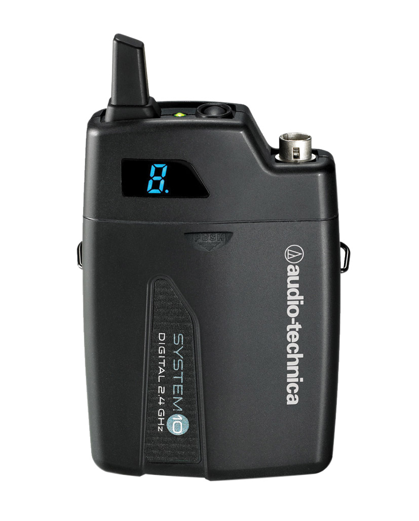 Le System 10 Audio Technica est un système numérique de microphone sans fil 24 bits/48 kHz, sans compander. Il fonctionne dans la bande de fréquences sans licence des 2,4 GHz. Le System 10 est "plug-and-play", ce qui l'adapte à un large éventail de groupes d'utilisateurs et d'applications telles que la présentation et les spectacles musicaux. Deux systèmes sont proposés, l'ATW-1102 avec micro à main pour la voix et le boîtier ceinture ATW-1101 UniPak, fourni sans microphone. Chaque configuration comprend l'ATW-R1100, récepteur à diversité d'antennes fixe 2,4 GHz et un seul émetteur portable de 10 mW (boîtier de poche ATW-T1001 émetteur main ATW-T1002). Un maximum de quatre systèmes (canaux) distincts peuvent être exploités sur un même site sans aucun problème de coordination de fréquences ou de sélection de groupe (remarque : bien que les composants puissent être achetés séparément, il n'est pas possible d'utiliser plusieurs émetteurs simultanément avec un seul récepteur). Une fonction de sélection automatique de fréquence garantit une configuration intuitive et des performances fiables et sans interférence. Les unités récepteur et émetteur intègrent toutes deux un affichage numérique d'identification du système "facile à lire" et un bouton de couplage. La mise en service ne prend que quelques secondes. Sélectionnez le numéro d'identification du système sur le récepteur et appuyez sur "Pair". Appuyer sur le bouton "Pair" de l'émetteur correspondant lance la sélection automatique de fréquence et couple les appareils. Le système propose trois niveaux d’assurance de diversité : fréquence, temps et espace. La diversité de fréquence envoie le signal sur deux fréquences allouées dynamiquement et exerce une surveillance permanente. Si nécessaire, le système change automatiquement de fréquence pour maintenir une communication fiable. La diversité de temps envoie le signal dans plusieurs créneaux de temps pour maximiser l’immunité envers les interférences des trajets multiples. Enfin, la diversité d’espace utilise deux antennes sur chaque émetteur et récepteur pour maximiser l’intégrité du signal.