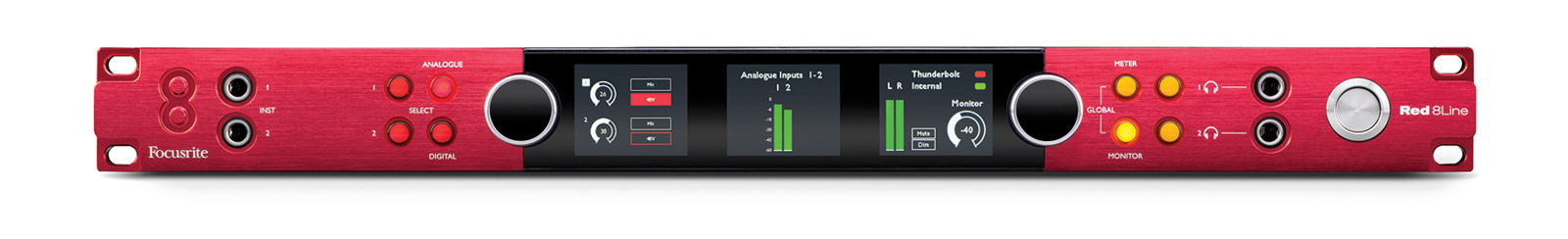 Chacun des deux préamplis micro Red Evolution à commande numérique offre un gain de 63 dB, une alimentation fantôme +48 V, un filtre passe-haut de 80 Hz (+/-3 Hz) et une inversion de phase. Une option permettant de relier les deux canaux en stéréo et un mode "Air" commutable peuvent également être utilisés pour un meilleur résultat - le mode Air imitant le profil sonore du module d'entrée Focusrite ISA 110.