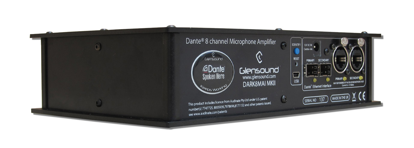 Le Dark1616M est une interface Ethernet Dante dédiée, pour installation en rack, conçue pour être utilisée dans des environnements de diffusion exigeants.Il dispose de seize entrées et sorties disponibles en parallèle en format analogique et numérique. Les entrées analogiques symétriques peuvent être sélectionnées pour micro, micro avec alimentation fantôme 48V ou niveau ligne, les sorties analogiques étant disponibles uniquement en niveau ligne. Les entrées et sorties numériques sont proposées sous forme de huit entrées et sorties AES (seize canaux numériques). Il peut être utilisé comme une interface autonome dans un réseau Dante ou en conjonction avec une seconde interface Glensound directement reliée, en "snake" audio, ou utilisé comme une interface connectée au réseau ou point à point avec les unités de commentateurs Dante de Glensound.