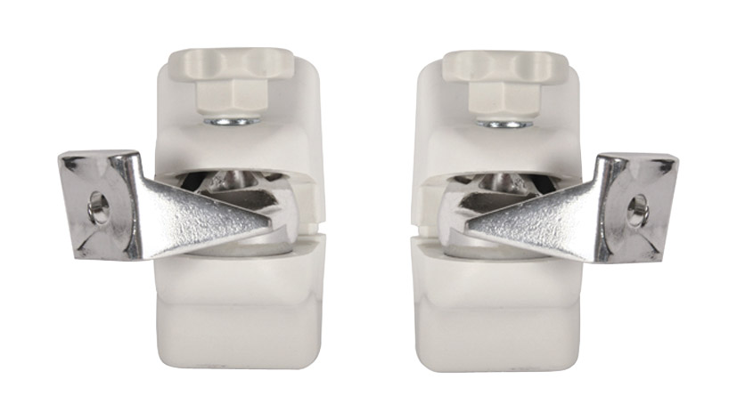 Ce modèle est adapté à la plupart des enceintes d'une largeur de 135 - 280mm, y compris celles à façade incurvée ou biseautée, car la fixation se fait par des coussinets antidérapants sur les côtés de l'enceinte. Une plaque d'acier verticale à bras horizontal est fixée au mur et recouverte d'un cache décoratif. Une plate-forme est montée sur le bras, l'enceinte est placée sur la plate-forme et deux pinces se resserrent sur l'enceinte. Disponible en noir ou blanc.