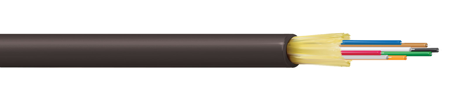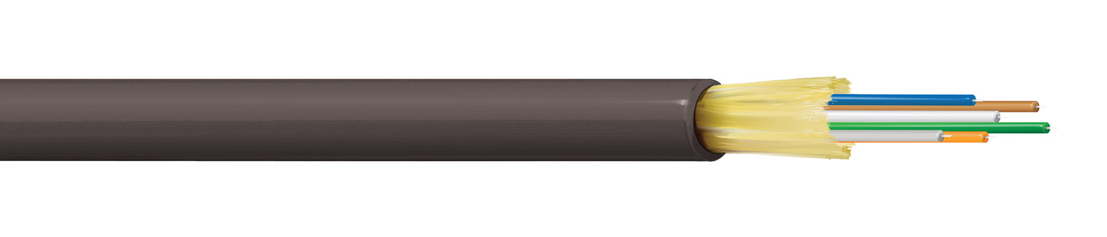 Construction dense et tamponnée présentant une excellente résistance aux chocs et à l'écrasement. Les gaines extérieure et intérieure en PUR offrent une flexibilité ainsi qu'une résistance à l'abrasion et aux produits chimiques, les fils de verre gonflables entre les deux gaines agissant comme des éléments de résistance supplémentaires. Sous la gaine intérieure est disposé un fil gonflable qui se dilate au contact de l'eau et étanche les petites coupures ou perforations. Ce câble rond compact est facilement enroulable et a une faible mémoire de forme. Disponible avec 2, 4, 6, 8, 12 ou 24 âmes. Ces versions multimodes ont une âme OM3 50/125 optimisée pour 850 nm et 1300 nm et conviennent à des débits de transmission allant jusqu'à 10 Gbit/s.