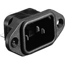Femelle (sortie secteur) type C13, sans volets, pour découpe 32.3 ×24.8mm, fixation Snap-in. Bornes à souder 2.9mm. Pour panneau d'épaisseur 1.5mm.