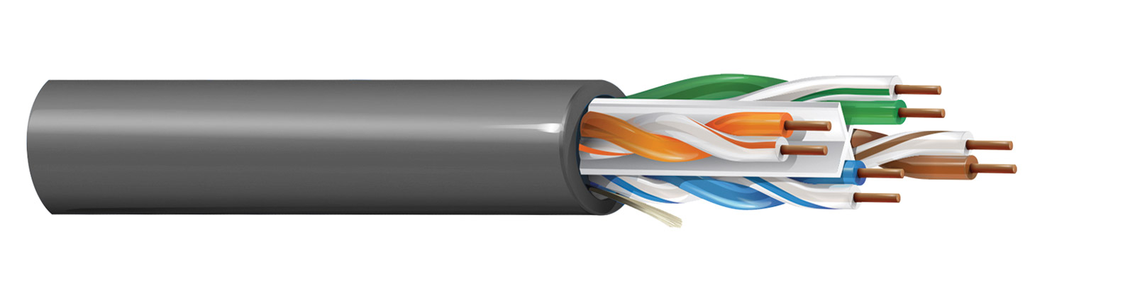 Câble à conducteur solide Catégorie 6 U/UTP 23AWG avec gaine en PVC. Les paires sont disposées autour d'une épine dorsale brevetée à profil en X (X-Spline). U/UTP Non blindé, paires torsadées non blindées.