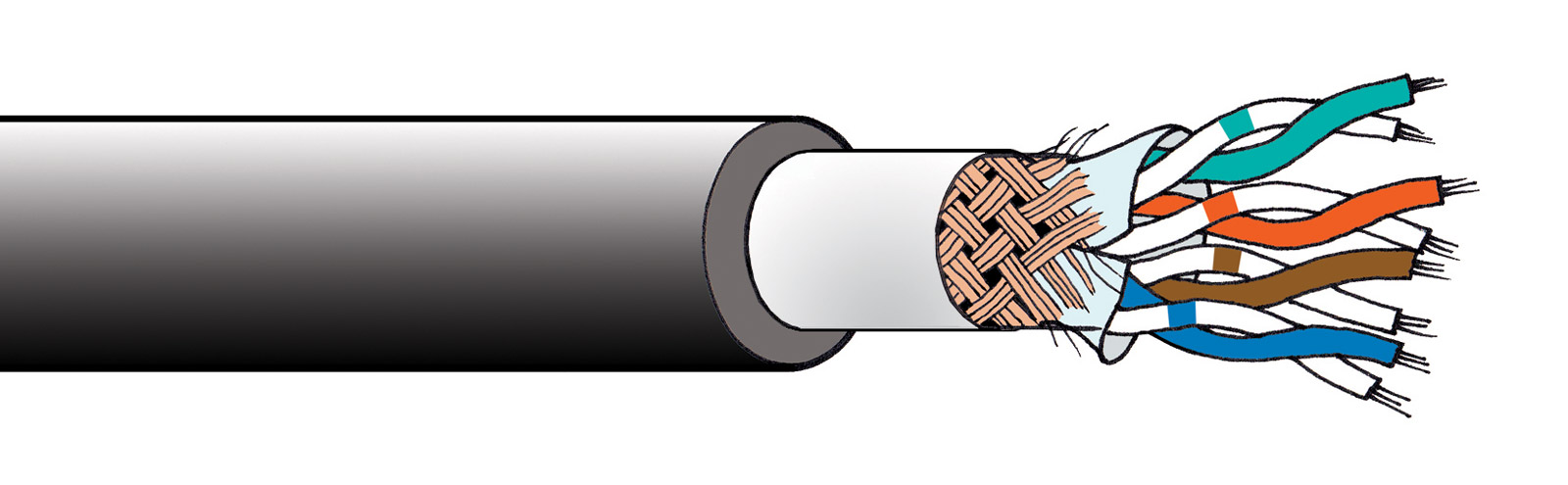 Cette version spécialisée de SF/UTP Cat5E (blindé par feuillard et tresse) a une très robuste gaine externe en polyuréthane et une flexibilité modérée. La gaine a deux couches, la couche interne en matériau faible risque incendie, permettant au câble d'être classé comme "faible risque incendie". Elle diffère aussi de la construction Cat5E standard par ses deux blindages; un feuillard et une tresse.