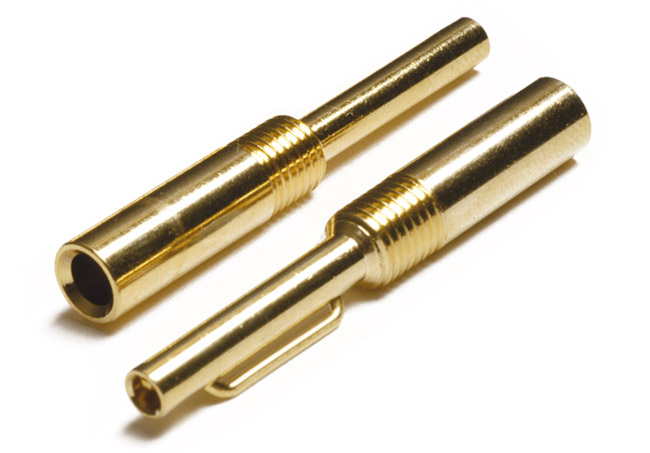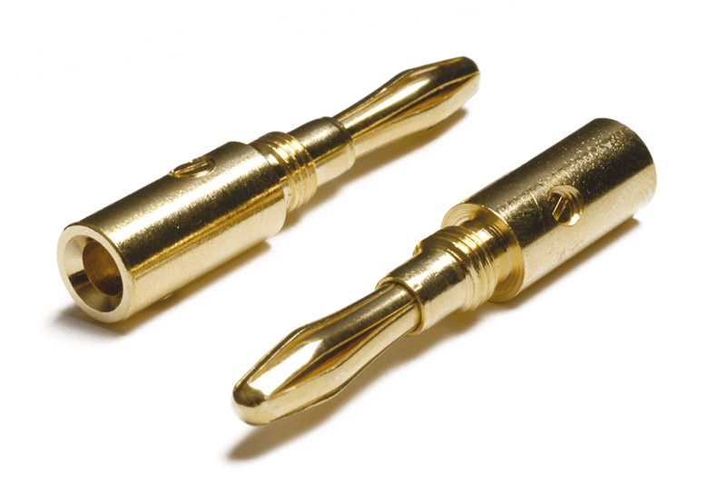 Fiches "banane" de 4mm en plaqué or, disponibles avec une variété d'options de raccordement. Le manchon, qui accepte des fils ayant un diamètre maximal hors tout de 7,2mm, se visse sur le corps du connecteur après raccordement.