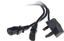 Les cordons A de type UK ont un câble de 1,5 mètre entre la prise 3 broches pour le et le diviseur en Y, puis deux longueurs de câble de 0,5 mètre chacune terminées par des connecteurs IEC 60320 type C13 femelles.