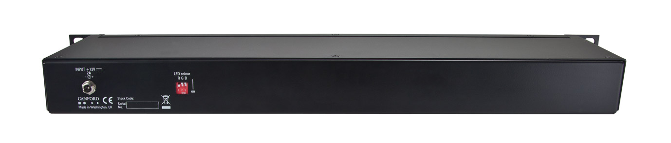 Le courant est fourni par un bloc d'alimentation 12V 2A avec fiche 3 broches UK. La connexion est assurée par un connecteur CC verrouillable de 2,1 mm pour garantir une connexion fiable lorsque l'appareil est utilisé dans des racks mobiles.