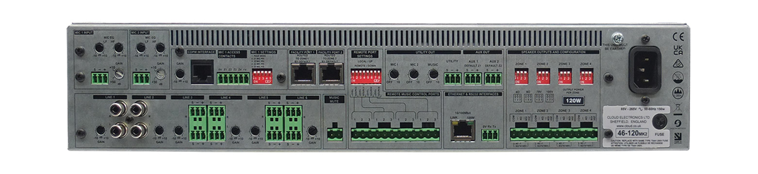 CLOUD 46-120MK2 AMPLI DE ZONE 4 zones, 4x 120W, hi/low-impedance, partage puissance, 2U Code stock : 93-0750