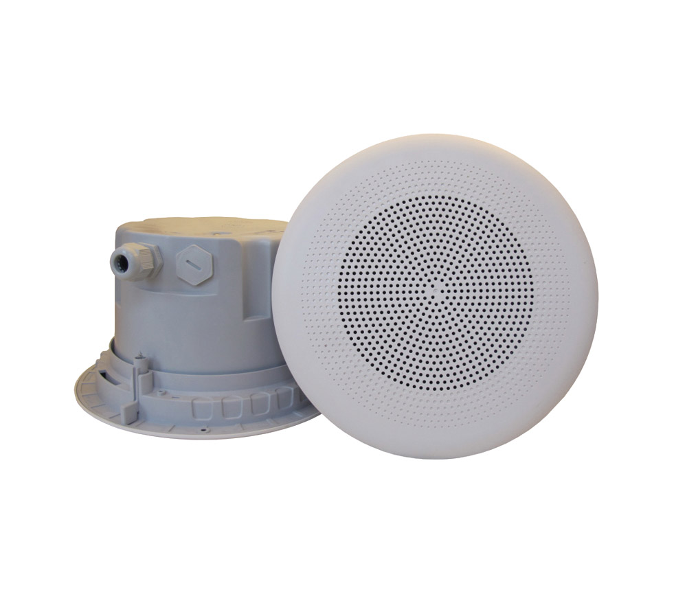 Le BP-560CR de DNH est un haut-parleur de plafond de 5 pouces, 6 watts, à montage rapide, encastré, pour salle blanche, avec un niveau de pression acoustique maximum de 95dB(A), adapté à des installations telles que les centres de recherche, la fabrication pharmaceutique et la préparation alimentaire. Ce haut-parleur est équipé d'un cône antichute adapté à une utilisation en salle blanche. Avec une réponse en fréquences de 70 Hz à 12 kHz et un angle de dispersion de 150° à 1 kHz, ce haut-parleur dispose d'une terminaison de câble par des bornes de connexion rapide à ressort. Les BP-560CR et BP-560CRT peuvent être montés directement dans un faux plafond/suspendu. Les modèles à tension de secteur sont équipés d'un transformateur à prises multiples qui permet de régler la sortie sonore.