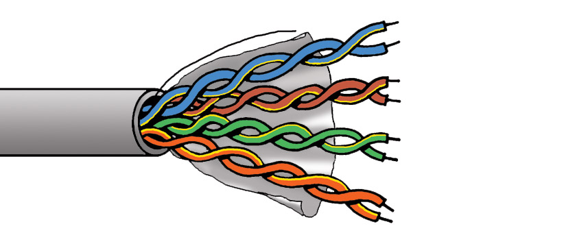 Disposition : Deux conducteurs isolés et torsadés, paires torsadées ensemble, selon le Code couleur des câbles Catégorie (Cat)