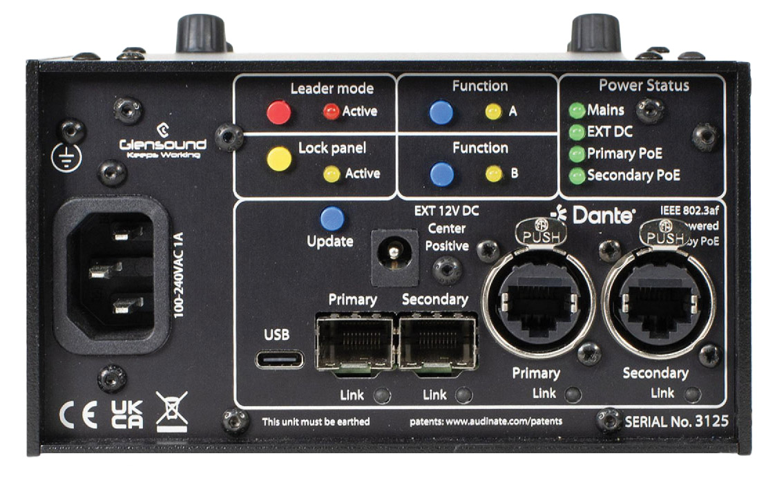 Dante connections: 2x Neutrik EtherCons Cat6 RJ45 connectors, 2x SFP slots. Type: Fully redundant primary and secondary circuits. Sample Frequency: 48k. Resolution: 24-Bit. Control and Routing: Via Glensound's free Dante Controller.