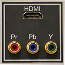 Prise HDMI de face avant reliée en interne à une prise HDMI arrière à 90 degrés, pour l'emploi de câbles HDMI prémontés. Aussi doté de trois prises RCA (cinch/phono) plaquées or pour la vidéo en composantes (marquées Pr, Pb et Y) avec connexions soudées à l'arrière. Les connexions RCA (cinch/phono) et HDMI sont disposées verticalement. Profondeur requise : 20 mm.