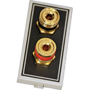 Deux borniers à vis plaqués or et connecteurs d'enceinte pour fiche de 4 mm (rouge, noir), connexion arrière par soudure plus prise 4 mm. Profondeur requise : 15 mm.