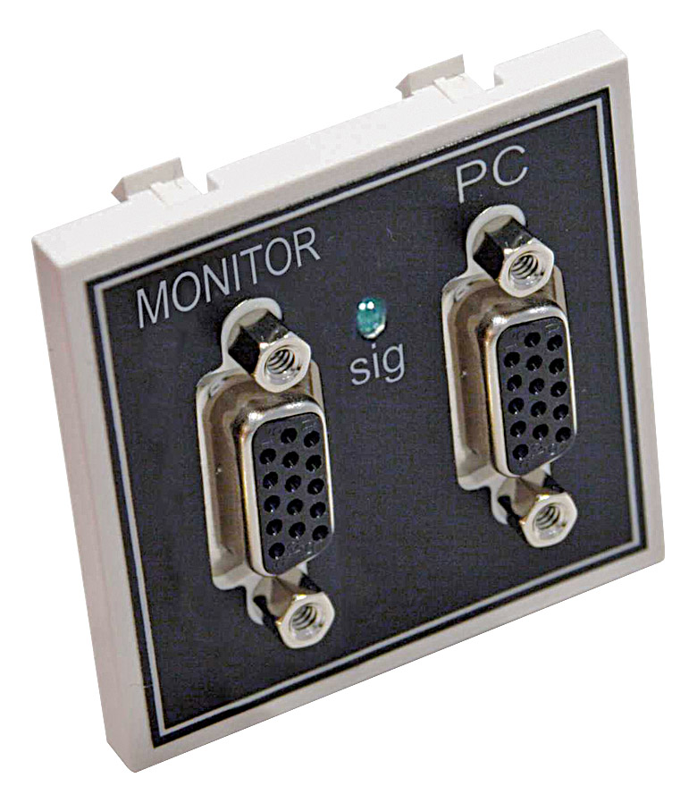 Prise HDD15 de face avant pour VGA et prise HDD15 à 90 degrés à l'arrière permettant l'emploi de câbles VGA prémontés. Le module est aussi doté de deux prises RCA (cinch/phono) plaquées or pour l'audio (marquées gauche et droite) avec connexions soudées à l'arrière. Profondeur requise : 35 mm. Note : en raison de la taille d'une fiche VGA, ce module doit toujours être utilisé à l'emplacement de droite d'un cadre de 100 mm.