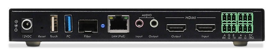 Sur le panneau arrière, une entrée d'alimentation 5V DC est positionnée à côté d'une sortie HDMI (entrée sur l'émetteur), d'une connexion RS232, d'un connecteur jack femelle 3,5mm pour 'Sensor IR' ('Emitter IR' sur l'émetteur), d'une prise jack femelle 3,5mm pour la sortie audio (audio in sur l'émetteur) et RJ45 pour la connexion LAN et l'alimentation POE.