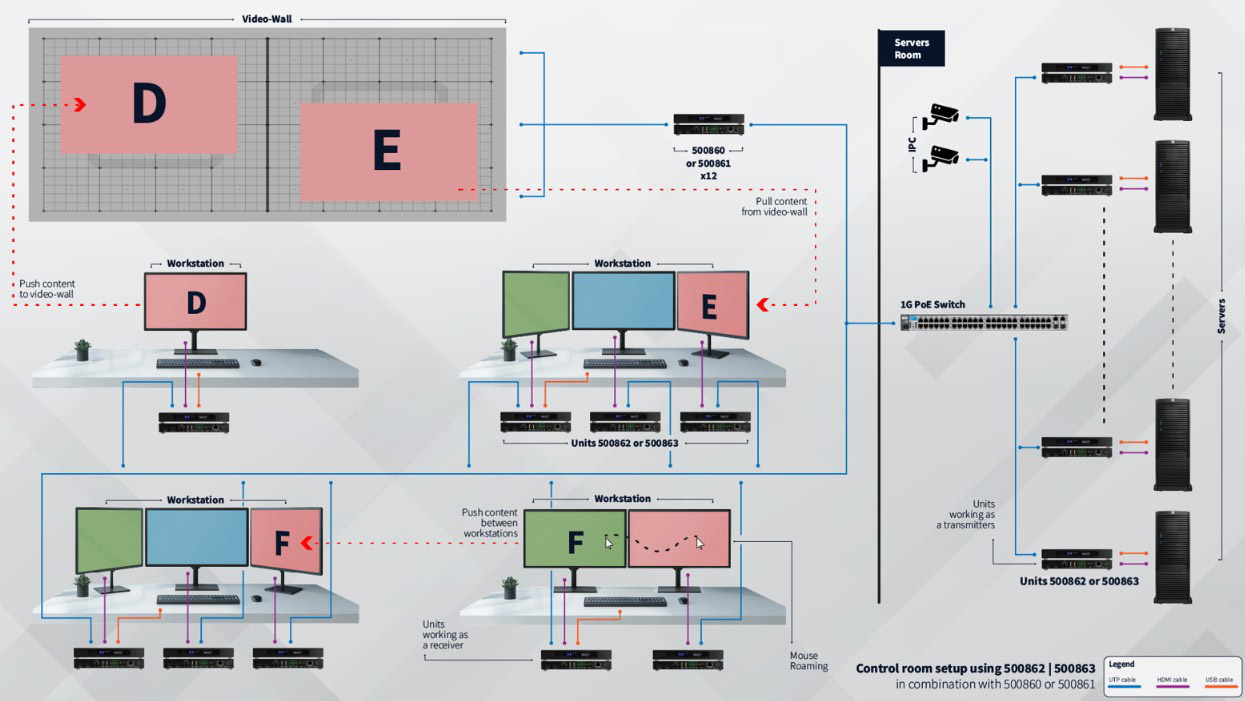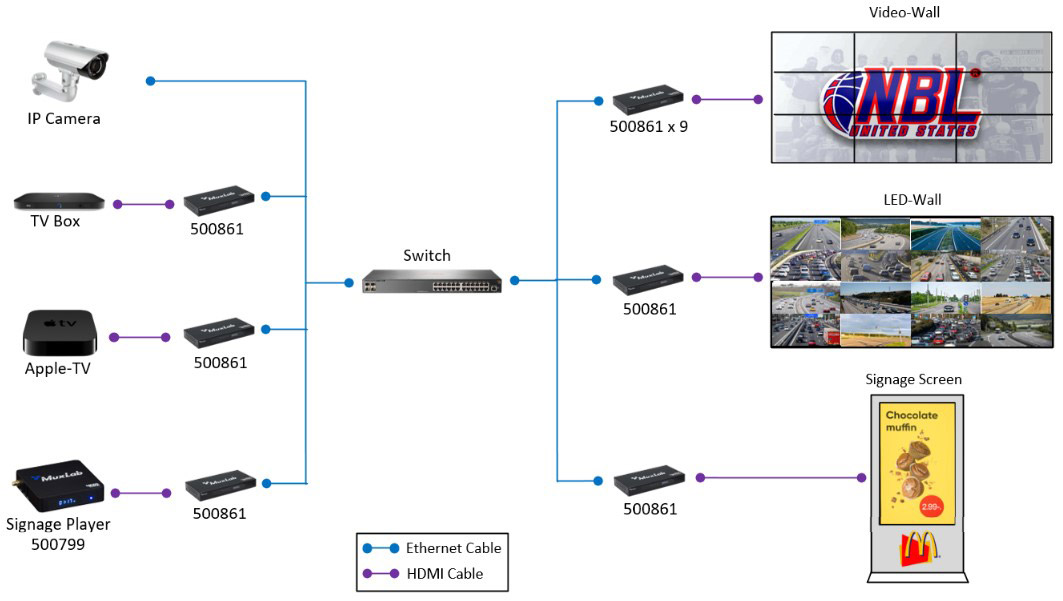Une combinaison émetteur (500754-TX) et récepteur (500754-RX) qui permet à l'utilisateur de créer un mur vidéo à partir d'une source HDMI. En fonction de la largeur de bande disponible, plusieurs récepteurs, un par écran, peuvent être reliés à une distance maximale de 100m par un câble Cat5e/6. Cette distance peut être portée à 120m lorsqu'un seul émetteur et un seul récepteur sont utilisés avec un commutateur de réseau.
