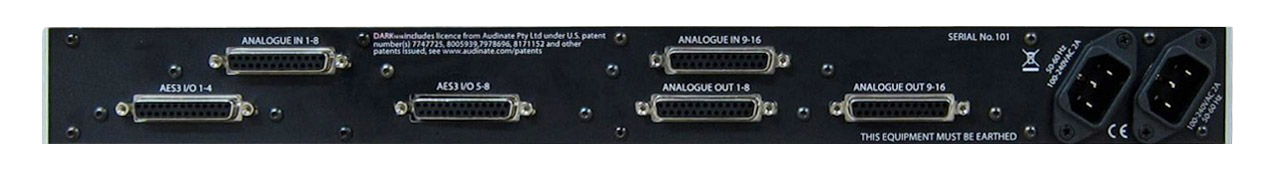 Le panneau arrière contient six connecteurs D-sub à 25 broches. Deux d'entre eux sont destinés aux entrées/sorties AES, AES 1-4 et AES 6-8. Deux sont pour les entrées analogiques, analogiques en 1-8 et analogiques en 9-16. Les deux derniers sont pour les sorties analogiques, analog out 1-8 et analog out 9-16. Toutes les sorties analogiques et AES sont toujours disponibles. Sur les entrées, tout signal AES valide aura la priorité sur les entrées analogiques. Deux entrées d'alimentation IEC alimentent les alimentations redondantes principales et secondaires.