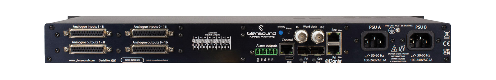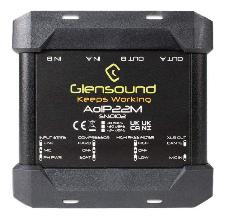 La Dark1616M est une interface Ethernet DANTE dédiée, montée en rack, conçue pour être utilisée dans des environnements de diffusion exigeants. Elle possède seize entrées et sorties disponibles en tant qu'entrées analogiques symétriques, qui peuvent être sélectionnées pour le microphone, le microphone avec alimentation fantôme 48V et les niveaux et sorties de ligne, et également en tant que huit entrées et sorties AES (seize canaux numériques). Elle peut être utilisée en tant qu'interface autonome dans un réseau DANTE ou en conjonction avec une seconde interface Glensound, directement reliée, comme un "snake " audio, ou utilisée comme interface connectée au réseau ou point à point avec les unités de commentateurs DANTE de Glensound.