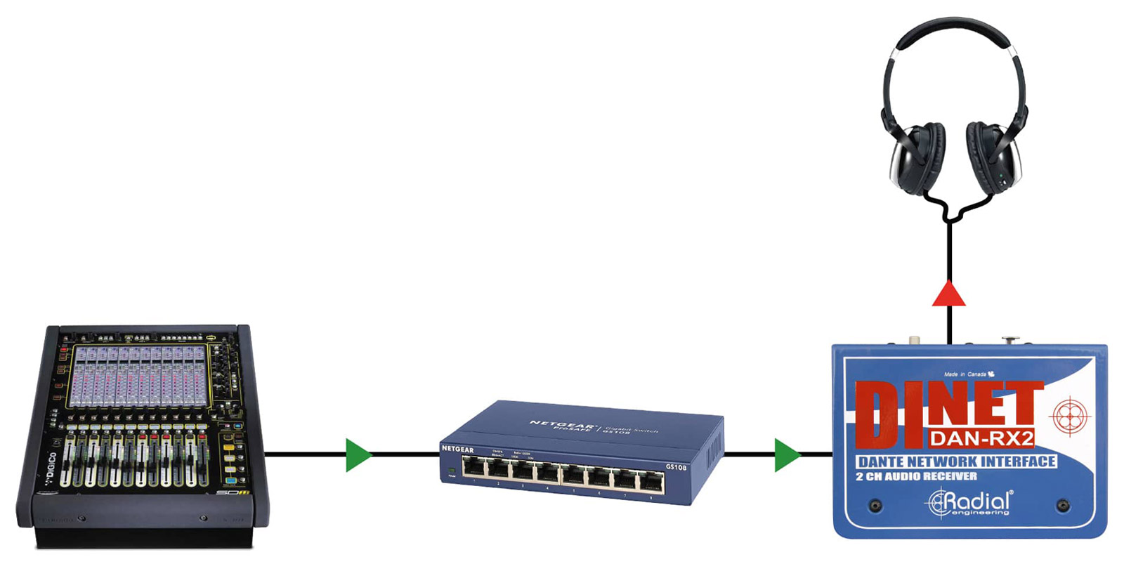 RADIAL DiNET DAN-RX2 NETWORK INTERFACE 2-channel Dante network to analogue, line level, receiver Code stock : 20-0062