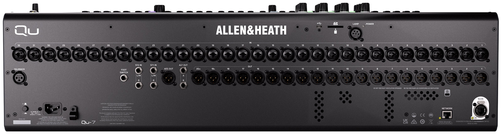 Qu-7 and Qu-7D are the largest console in the range with 38-input, 24-output. The consoles have 33x 100mm faders, 32x mic/line combination inputs, and 20x balanced 3-pin XLR outputs. A single 3-pin XLR connection allows for talkback, whilst 2x 6.35mm TRS jack connectors are included as additional output connections. A single AES3 digital audio output is provided by way of 3-pin XLR connection, and an SLink connection via RJ45 EtherCon for optional Everything I/O series expanders. A 12V lamp socket is positioned to the upper right side of the rear facing panel.