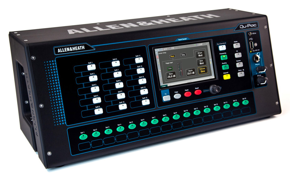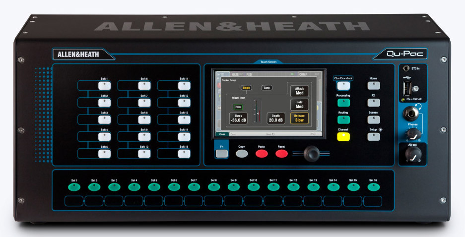 Qu-Pac features 4x stereo RackFX engines, with emulations of classic reverbs, gated reverbs, delays, modulators, and flangers amongst others. The digital effects are returned to the mix on dedicated return channels, so as not to tie-up mono and stereo input channels. Each Stereo FX Return has a dedicated 4-band parametric EQ. The large touchscreen allows the user functionality to setup and adjust the channels, with a Qu-Control key bringing up a fully customizable screen which gives access to channels and settings tailored to the user and application. Several ‘widgets’ can be assigned to the page, including channel levels, mutes and assignment on/off switches, and are arranged to suit the user requirement, for example, as a source selection and level control of background music to one or multiple zones. A built-in audio interface can record up to 32-tracks to Mac or PC, and returns from the computer can be assigned to the Input channels of the mixer. An integrated multitrack USB recorder provides 18-channels of 48kHz, 24bit recording and playback straight to or from a USB key or hard drive. Standard MIDI control is sent over the USB and network connections. This can be mapped to the faders of a DAW using Allen & Heath's MIDI Control app - which provides easy setup and emulation of HUI or Mackie Control protocols.