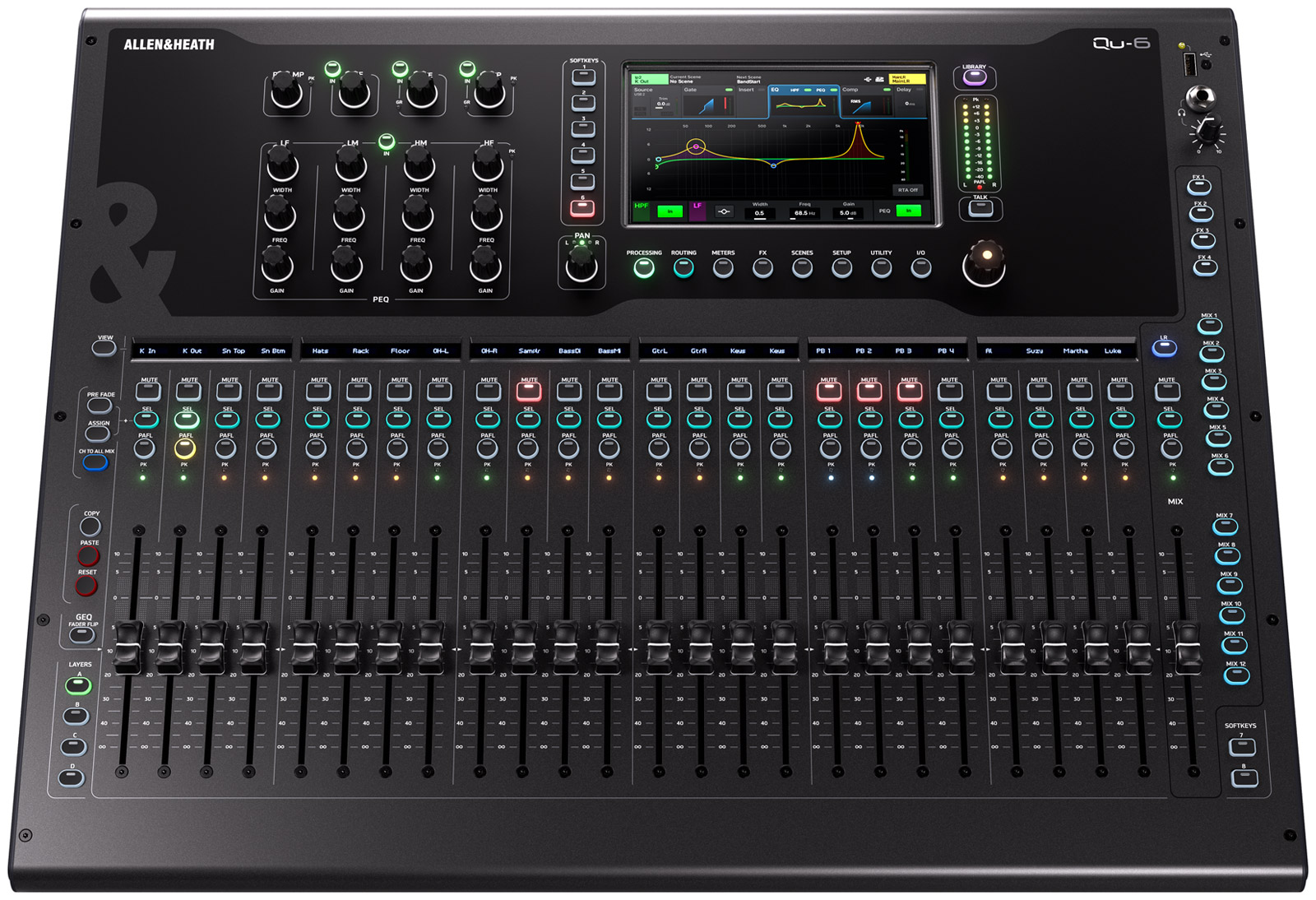 Qu-6 and Qu-6D are the mid-sized 96kHz consoles of the Qu series with 38-inputs and 24-outputs. The mixers have 25x 100mm faders, 24x mic/line combination inputs, and 16x balanced 3-pin XLR outputs. A single 3-pin XLR connection allows for talkback, whilst 2x 6.35mm TRS jack connectors are included as additional output connections. A single AES3 digital audio output is provided by way of 3-pin XLR connection, and an SLink connection via RJ45 EtherCon for optional Everything I/O series expanders. A 12V lamp socket is positioned to the upper right side of the rear facing panel.