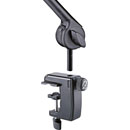 Bras de microphone de table - Se fixe à la fois sur des surfaces planes et des tubes, avec une plage de serrage allant jusqu'à 53 mm. Un bras télescopique en deux parties, avec une portée de 560-1020mm, peut être incliné à 360 degrés et verrouillé en place au moyen d'un grand bouton moleté. La longueur de la perche extensible est ajustée par une vis à tête moletée et surmontée d'un filetage de 3/8 de pouce pour le raccordement de pinces à microphone. Poids : 0,76 kg. Finition noire.