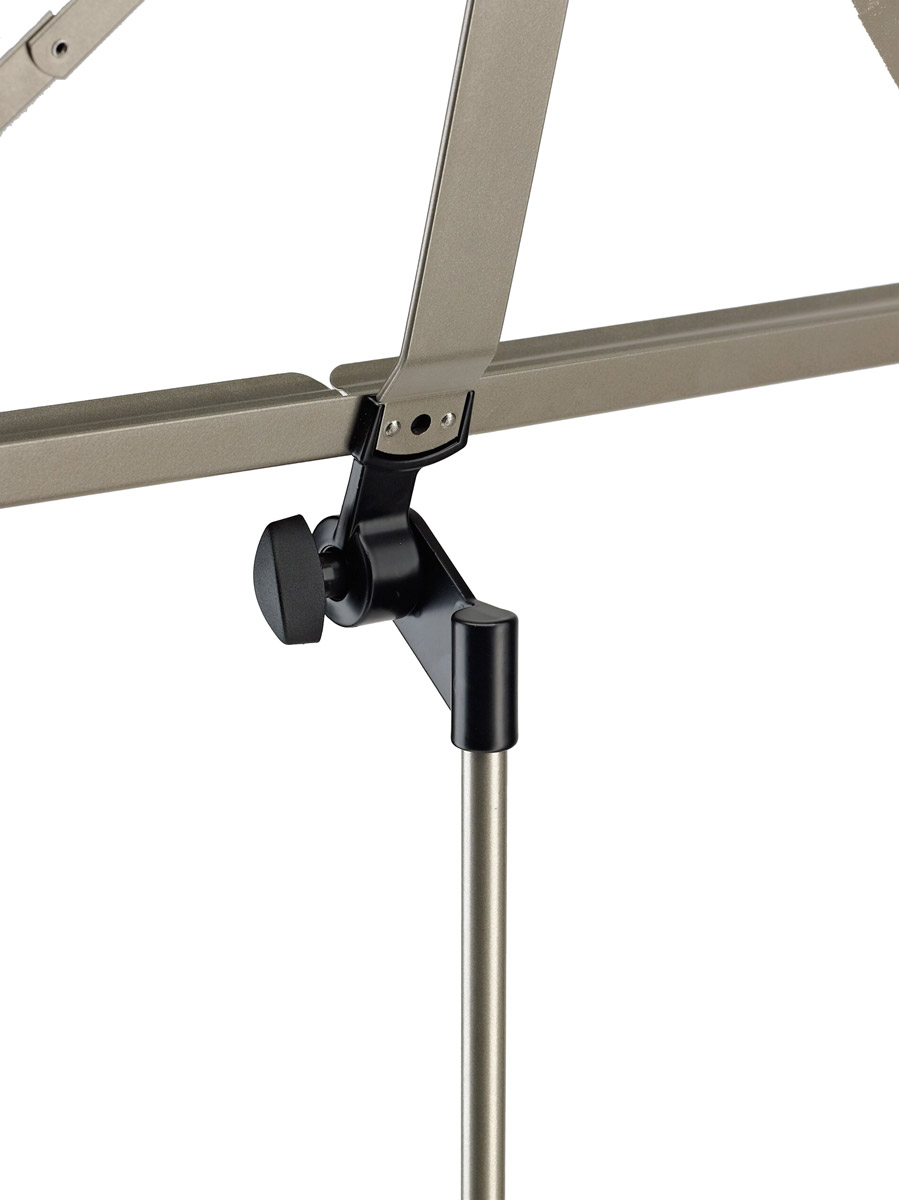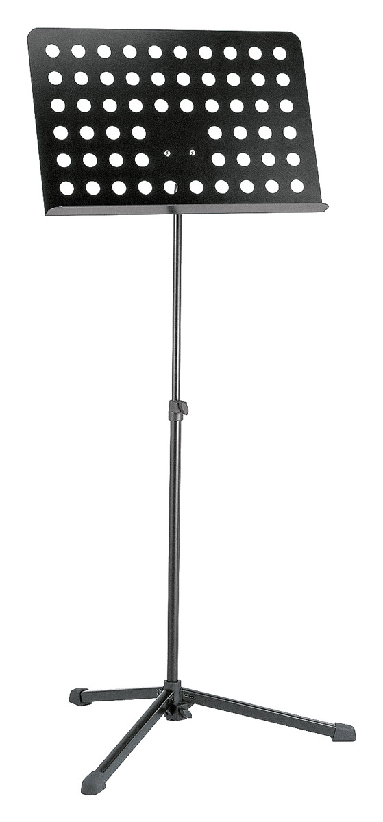 Pupitre d'orchestre fabriqué en acier avec des tubes en deux parties réglables en hauteur avec plateau en acier ajouré de 498 x 324 mm. Les pieds à profil en U s'enclenchent dans leur logement correspondant pour assurer la stabilité et le pupitre est relié par un système de verrouillage rapide et deux vis de blocage. Le support est réglable en hauteur de 610 à 1080 mm. Poids : 3 kg.