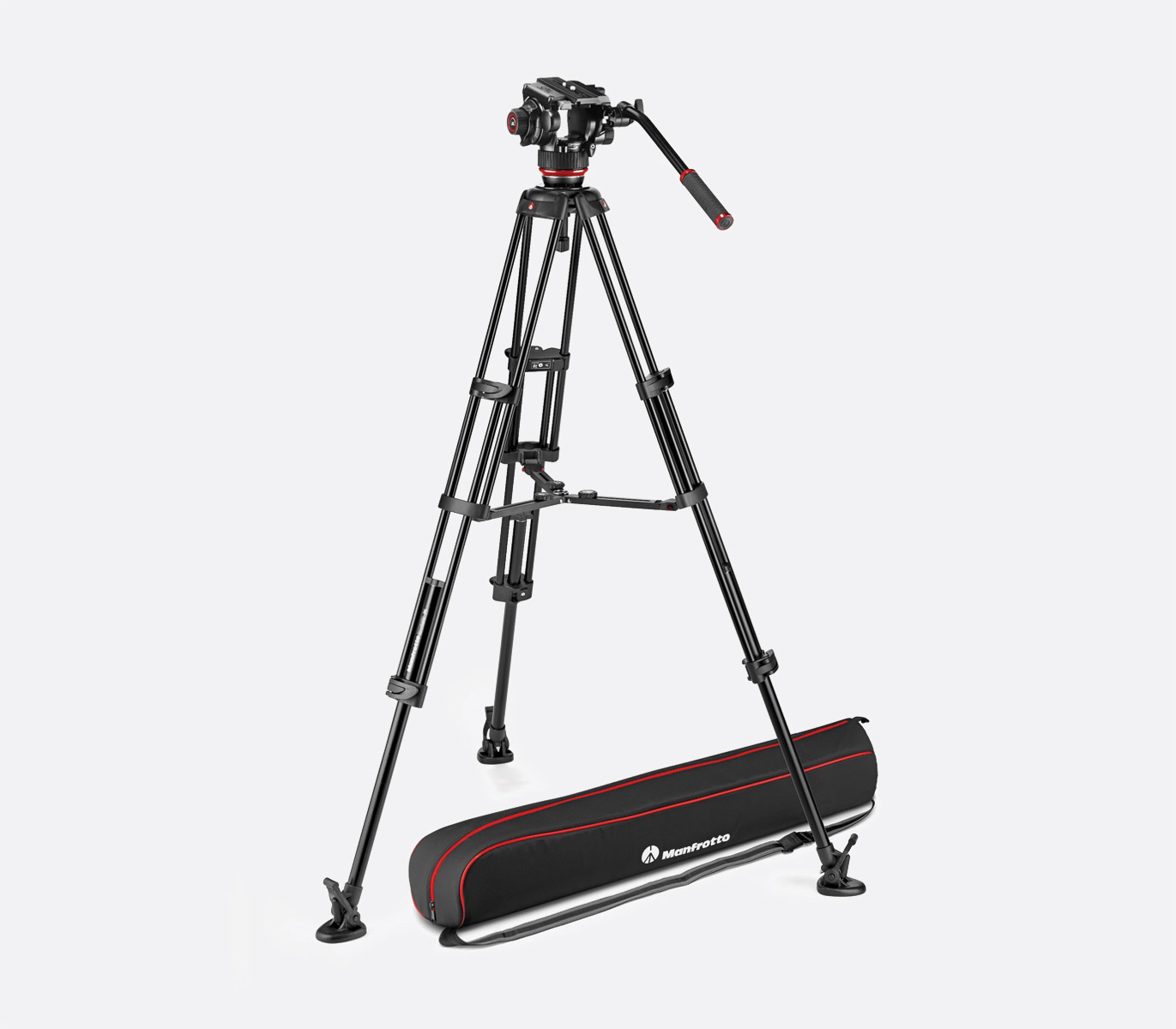 Ce trépied a une hauteur maximale de 169 cm et comprend une tête fluide 504X et un trépied à deux jambes en aluminium MVTTWINMA avec écarteur central.