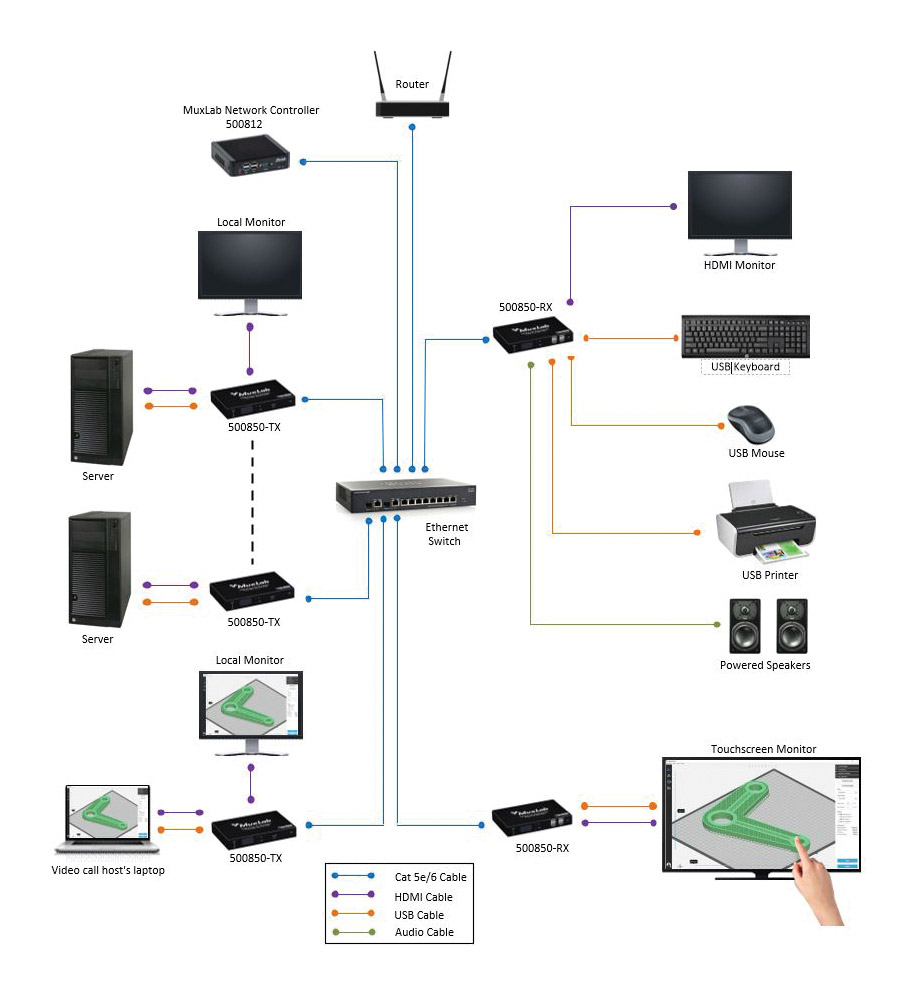 Un émetteur (500752-TX) et un récepteur (500752-RX) qui permettent de connecter des équipements HDMI sur une distance allant jusqu'à 100m à 1080p au moyen d'un simple câble à paires torsadées non blindées Cat5e/6. Le fonctionnement normal se fait dans une configuration point à point, mais il est possible de faire du point à multipoint et du multipoint à multipoint en connectant plusieurs émetteurs et récepteurs au même réseau Ethernet. Il est important que le commutateur Ethernet dispose de ports Gigabit, d'une capacité de serveur DHCP et d'un protocole de communication IGMP pour que ces configurations supplémentaires fonctionnent correctement.