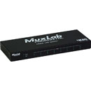 Ce splitters HDMI 1x4 (500426) est conçu pour distribuer un signal HDMI 2.0 vers 4 affichages HDMI. Il prend en charge la vidéo jusqu'à 4K 60Hz (4:4:4), HDR, Deep Color et les formats audio LPCM 7.1CH, Dolby TrueHD, Dolby Atmos, DTS-HD Master Audio et DTS:X. Ils sont conformes HDCP 1.4 et 2.2 et ont des boutons rotatifs de six paliers pour sélectionner le mode EDID approprié. Le panneau arrière présente toute la connectique d'entrée/sortie, à l'exception de la prise USB de service sur le 500426. Toute la connectique est présentée sur connexions HDMI à part l'entrée secteur CC.
