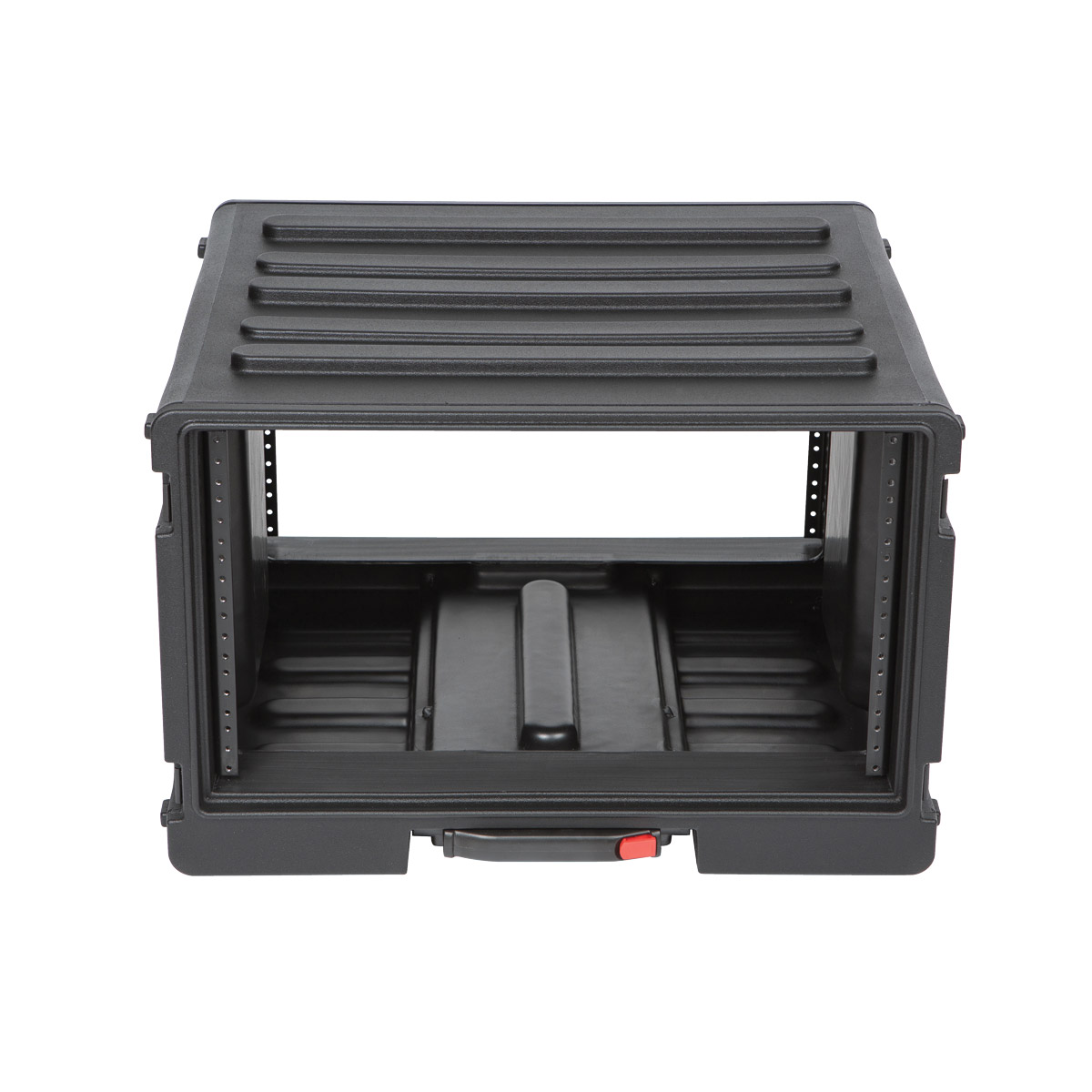 Les panneaux avant et arrière sont fixés à la partie principale à l'aide de fermetures papillons de qualité militaire. Des joints d'étanchéité permettent de protéger le contenu. L'intérieur présente des rails filetés à l'avant et à l'arrière. Des reliefs longitudinaux permettent un gerbage stable avec d'autres caissons Roto. Voir SKB CASES - ROTO - CAISSONS RACK ROTOMOULES et voir SKB CASES - ROTO - CAISSONS ROTOMOULES - Etroits.