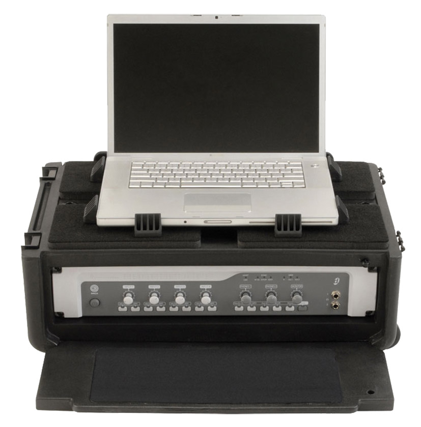 Les flights rack Studio Flyer SKB combinent un espace rack vertical avec une surface suppérieure innovantes qui permet l'utilisation de scratch et d'équerres réglages pour sécuriser des ordinateurs portables sous un couvercle amovible rembourré de mousse.