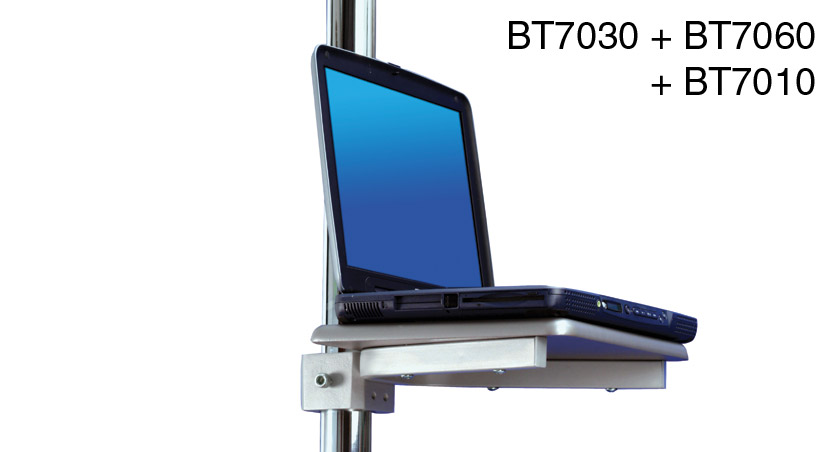 Les étagères BT7030, BT7040 sont des plates-formes destinées à recevoir des PC portables, magnétoscopes, projecteurs. Elles font respectivement 300 x 300 mm, 400 x 400 mm, 360 x 360 mm. L'adaptateur BT7035 est à commander séparément.