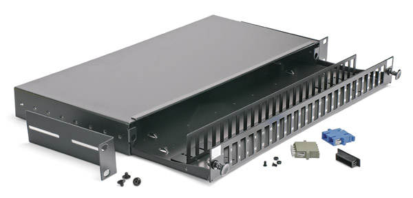 Les raccords SC font deux fois la taille des raccords LC, aussi les découpes de panneau peuvent-elles accepter une SC unidirectionnelle ou une LC bidirectionnelle, ou sinon une découpe plus grande pourra accepter une SC bidirectionnelle ou un quadruple raccord LC. Des plaques de masquage peuvent servir à occulter les découpes non employées. Les panneaux ont un tiroir coulissant intégré et des équipements de gestion des fibres optiques offrant un accès facile pour le raccordement, la reconfiguration et la recherche de défaut. La face arrière est équipée d'un passe-câble. Finition noire avec bande-légende peinte en blanc.