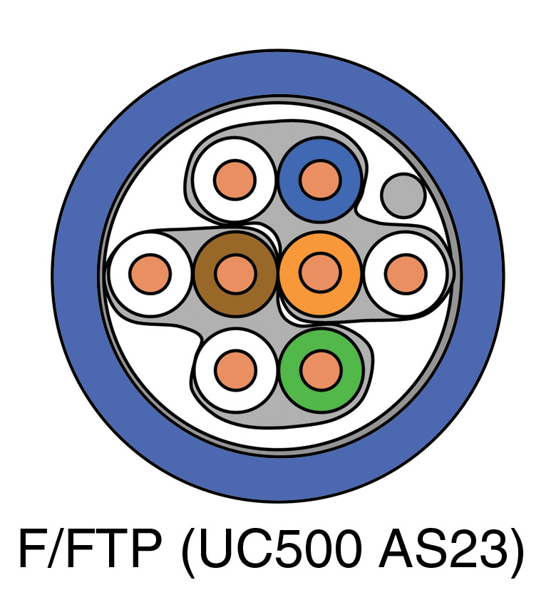 Ils ont un feuillard de blindage breveté par Draka sur les paires 1 et 2 (bleue, orange) et un autre sur les paires 3 et 4 (verte et marron). Le modèle F/FTP est comme l'U/FTP mais comprend une tresse de blindage globale.