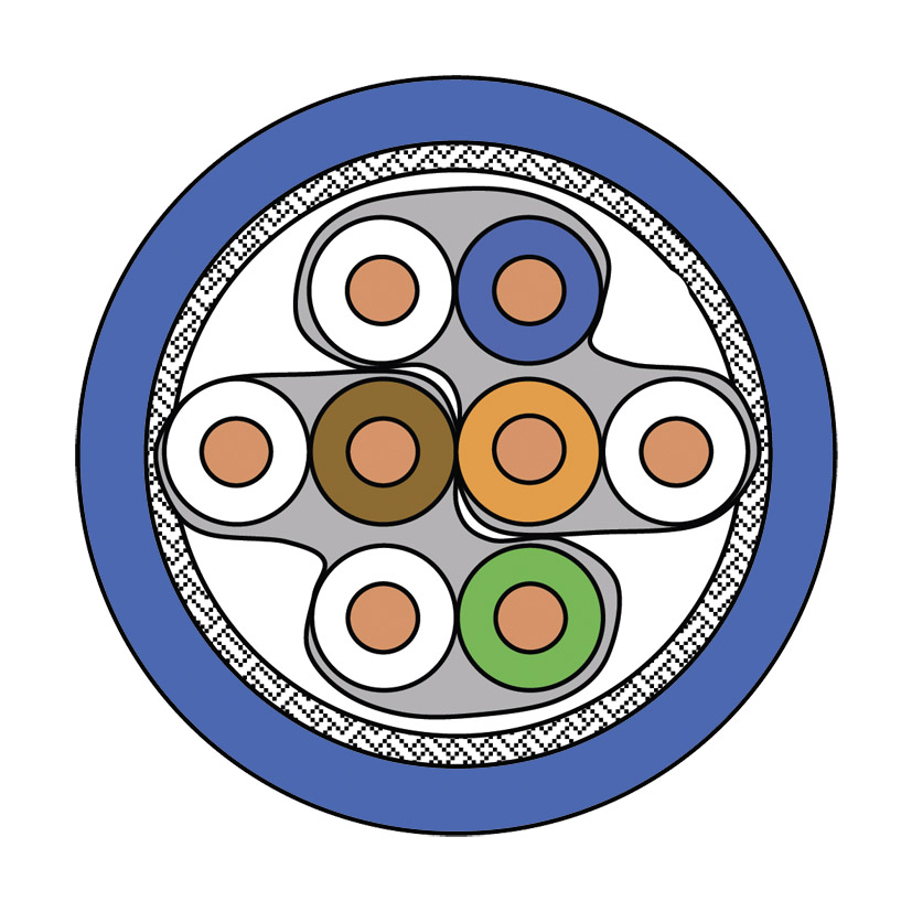 Ils ont un feuillard de blindage breveté par Draka sur les paires 1 et 2 (bleue, orange) et un autre sur les paires 3 et 4 (verte et marron). Le modèle F/FTP est comme l'U/FTP mais comprend une tresse de blindage globale.