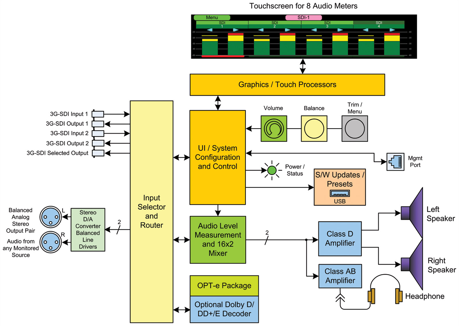 La mesure de l'intensité sonore utilise les normes ITU-R BS.1770 ou EBU R128. La connectivité comprend 2 entrées 3G-SDI via des connecteurs BNC, 1 sortie 3G-SDI (de la source sélectionnée) via un connecteur BNC. Des cartes optionnelles permettent d'obtenir 8 canaux d'entrée/sortie analogiques supplémentaires.