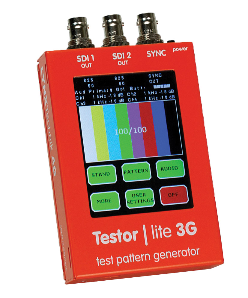 Le Testor lite 3G de Lynx est un générateur compact de mire vidéo SDI et de tonalité test, conçu pour répondre à une multitude de besoins de test et de vérification dans les infrastructures numériques modernes. Le grand écran tactile couleur fournit une interface utilisateur simple, intuitive, pour choisir les formats, la mire et le contenu du texte. La batterie rechargeable intégrée fournit jusqu'à quatre heures d'utilisation en continu ; des options d'extinction automatique sont disponibles pour économiser l'énergie.