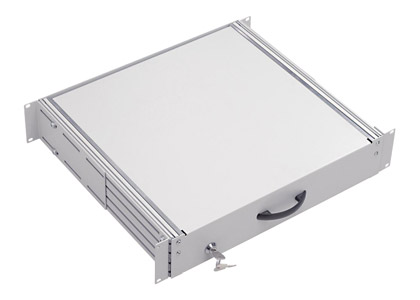 Tiroir en acier soudé glisse sur glissières télescopiques en boîtier en acier. Une fois fermée, le tiroir est affleurant aux fixations rack. La face avant est dotée d’une poignée en forme de U ainsi que d’un verrou cylindre.