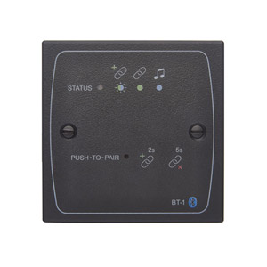 BT-1E et BT-1F sont des modules d'entrée sans fil Bluetooth pour installation murale déportée. Un seul bouton permet à l'utilisateur de coupler un appareil pour un fonctionnement sécurisé, tandis qu'un autre mode non sécurisé peut être configuré à l'installation. Une LED bicolore indique la progression de la connexion et l'activité de streaming. Le réglage du niveau de puissance RF réduit le risque de connexion accidentelle entre les pièces.