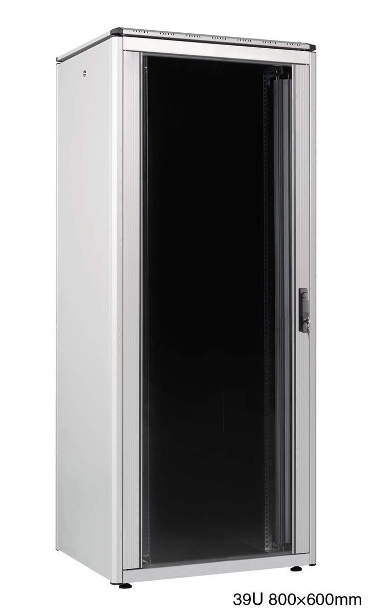 Disponibles en profondeurs de 600mm, 800mm et 1000mm. Chaque rack possède quatre piliers formant le châssis du rack, fixés à un cadre en haut et en bas. Des traverses horizontales se fixent sur les piliers, dans la direction avant-arrière. Des profilés de montage (cornières de rack) se fixent à l'avant et à l'arrière des traverses et sont réglables sur la profondeur de l'armoire pour permettre l'installation de rails coulissants de rack et d'équipements plus ou moins profonds. Les cornières de montage ont deux jeux de perforations pour recevoir les écrous cages, afin de fixer les équipements sur les faces libres du rack et les accessoires, comme les étagères et les supports de châssis, à l'intérieur du rack. Il y a trois orifices à écrou cage pour 1U sur chaque face et une sérigraphie marque les unités de hauteur en "U" pour faciliter l'installation.