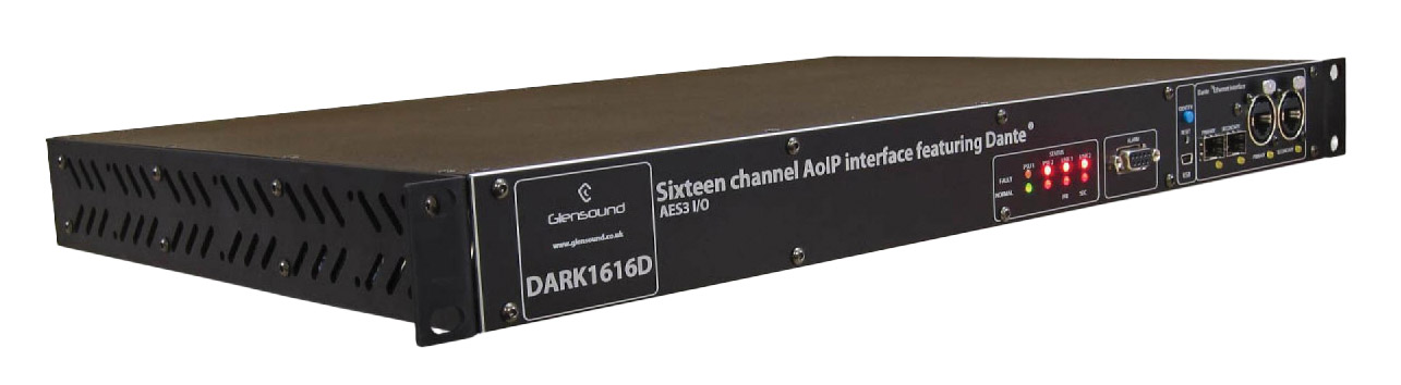 La Dark1616 est une interface Ethernet DANTE dédiée, montée en rack, conçue pour être utilisée dans des environnements de diffusion exigeants. Elle dispose de seize entrées et sorties, disponibles en entrées et sorties analogiques symétriques, et également en huit entrées et sorties AES (seize canaux numériques). Elle peut être utilisée comme une interface autonome dans un réseau DANTE, ou en conjonction avec une seconde interface Glensound directement reliée, comme un " serpent " audio, ou pour une utilisation comme interface connectée au réseau ou point à point avec les unités de commentateurs DANTE de Glensound.