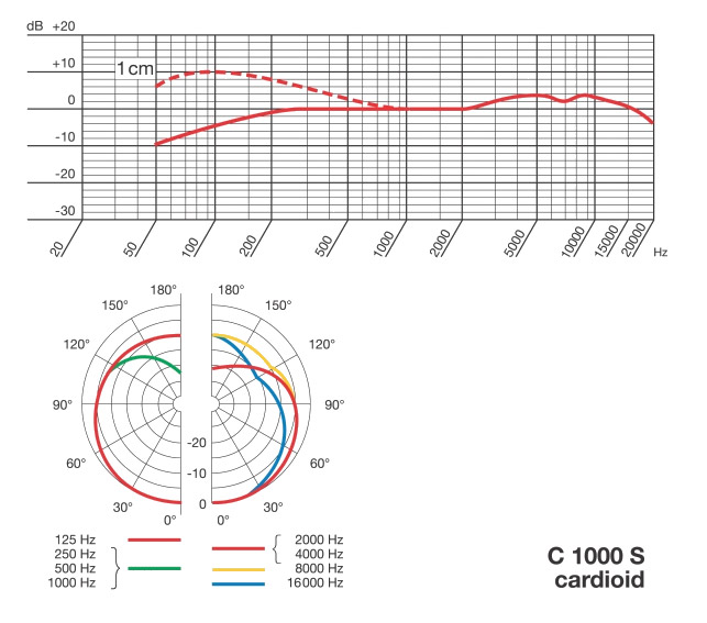 Le corps de la capsule, pulvérisée d'or, rend le microphone extrêmement résistant à l'humidité. Si aucune alimentation fantôme n'est disponible, le C1000 S peut être alimenté par deux piles AA standard avec une autonomie pouvant aller jusqu'à 120 heures. Des boutons pour l'activation d'un filtre coupe-bas et de l'atténuateur -10 dB sont positionnés dans le compartiment à piles. Il est doté d'un bouton marche arrêt silencieux accompagné d'une LED témoignant de l'état des piles.