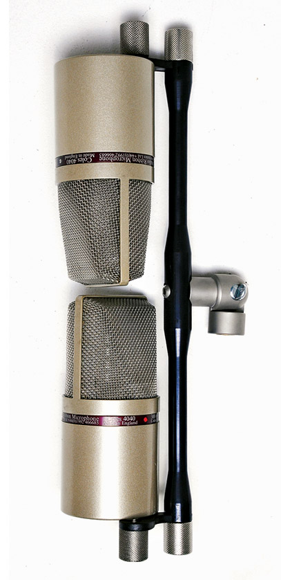 Accessoires en option : 4040 Barre stéréo pour le montage de deux microphones 4040. Un support de montage stéréo est disponible séparément, ce qui permet de placer deux micros tête à tête verticalement sur un pied à n'importe quel angle entre zéro et quatre-vingt-dix degrés.