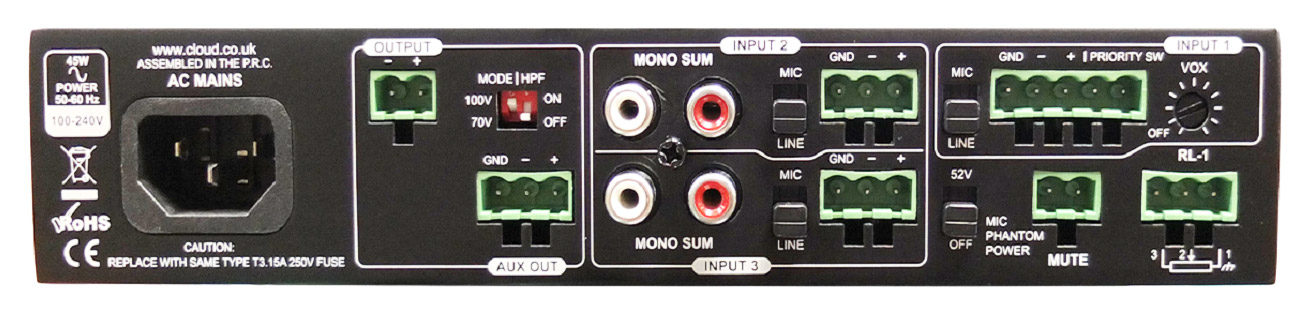 Le panneau arrière est doté d'une entrée symétrique pour un microphone de d'annonce sur un connecteur à 3 pôles amovible de type "Euroblock" ou "Phoenix". Une version à 2 pôles fournit la connexion d'accès, et le gain est réglé par une commande rotative actionnée par un tournevis. Quatre paires de connecteurs RCA (phono) assurent les entrées de ligne ; chaque paire est dotée d'une commande rotative actionnée par un tournevis pour régler le gain. La deuxième paire d'entrées de ligne est également dotée d'une prise jack stéréo de 3,5mm en guise de connexion alternative. Un connecteur Euroblock à 3 pôles fournit l'entrée pour les panneaux de commande à distance optionnels, RL-1 ou RSL-4, avec un commutateur permettant de choisir entre local et distant. Un connecteur Euroblock à 2 pôles offre l'entrée pour la mise en sourdine de la musique, qui peut être un contact normalement ouvert ou fermé.
