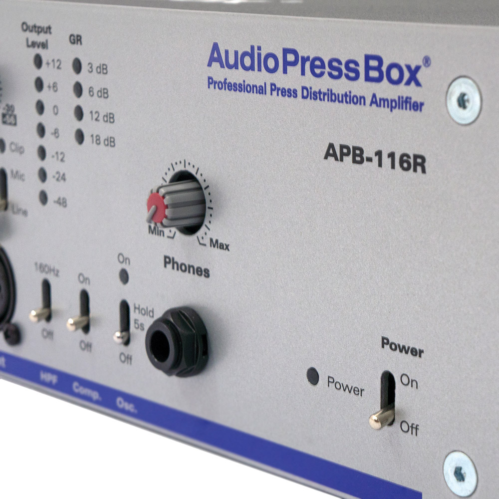 Le APB-116P a deux panneaux inclinés à l'avant et à l'arrière. Les côtés latéraux sont en bois avec fentes tenant lieu de poignées de transport. L'arrière présente 16 sorties XLR avec commutateurs niveau micro/ligne. Les réglages, entrée et entrée alimentation, sont présentés à l'avant de l'appareil.