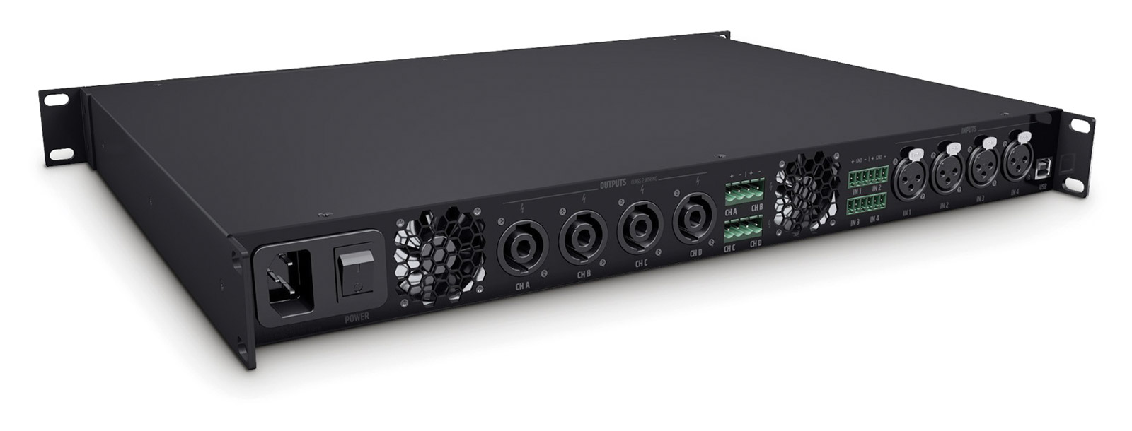 Le panneau arrière regroupe toute la connectivité entrée/sortie, y compris 4 entrées ligne symétriques sur XLR 3 points, 4 entrées sur bornier 3 points à utiliser comme alternatives aux entrées XLR, 4 sorties SpeakON et 4 sorties sur bornier 2 points à utiliser comme alternatives. L'alimentation secteur est assurée par un connecteur IEC avec un interrupteur à bascule associé. Le panneau frontal comporte un écran OLED, un cadran à double fonction (pousser et tourner) et un grand orifice pour le ventilateur à température contrôlée.